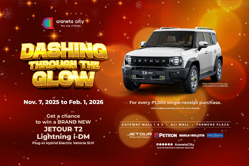 The Dashing Through the Glow car raffle promo gives one lucky Araneta City-zen the chance to bring home a brand-new Jetour T2 Lightning iDM Plug-in Hybrid Electric Vehicle. A single-receipt purchase worth ₱1,500 from participating establishments qualifies for an e-raffle entry. This includes receipts from Gateway Mall 1, Gateway Mall 2, Ali Mall, Farmers Plaza, Farmers Market Arcade, Farmers Garden, and other commercial establishments across the City of Firsts.