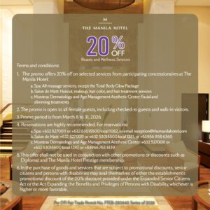 Ladies may unwind with a 20% off non-packaged massages at The Manila Hotel Spa. At Salon de Matt, women can refresh their looks with 20% off haircuts, makeup, hair color, and hair treatments. Meanwhile, Montesa Dermatology and Age Management Aesthetic Center offers 20% off select facial and slimming treatments, delivered by expert practitioners using advance aesthetic technologies.